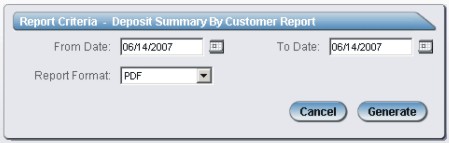 A date range and format must first be specified. This report presents a view of all the deposits processed for a particular CUSTOMER showing totals and distributions to BOC and Check21.